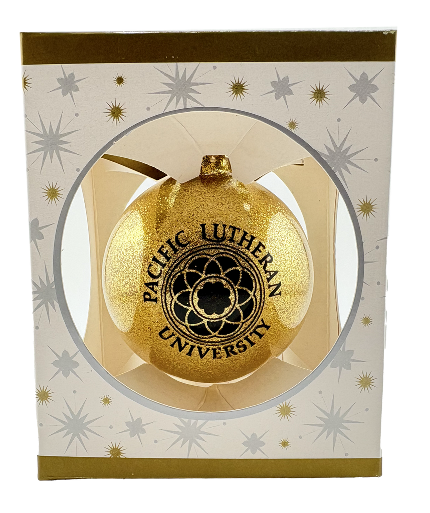 Sparkly Gold ornament with Black Pacific Lutheran University and the Rose Window
