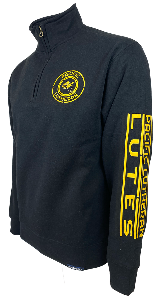 CI Sport Black Vulture 1/4 Zip with Pacific Lutheran University in Gold on left chest and Pacific Lutheran and LUTES down left arm