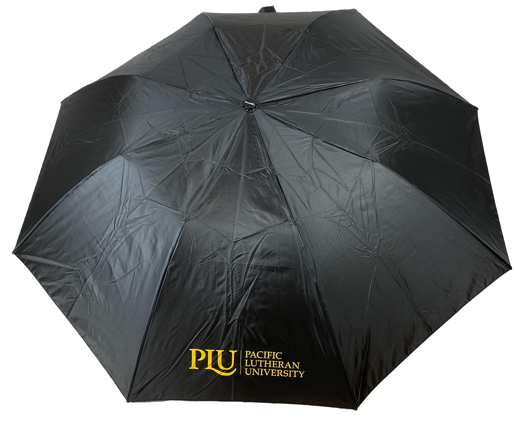 Black compact umbrella with PLU and Pacific Lutheran University in Gold