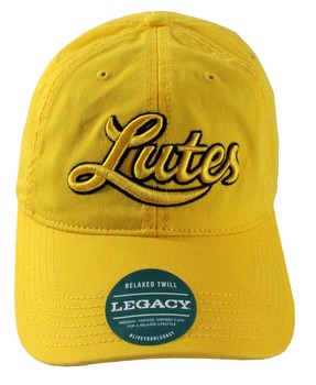 Hat with gold Cursive Lutes on front. Adjustable band with buckle.
