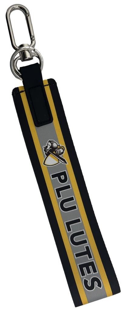 Extra Wide Lululemon style key tag with PLU Lutes and the Knight on a Black, Gold and Gray striped background