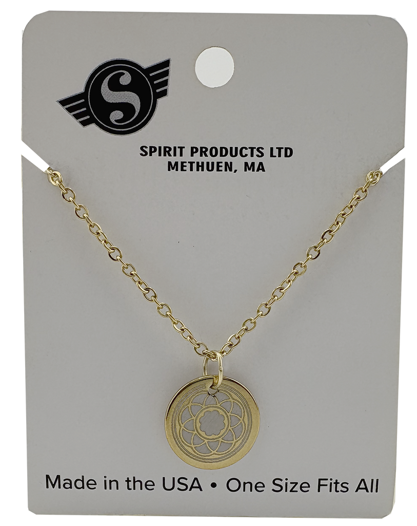 Laser engraved Rose Window on a Gold plated Stainless Steel 5/8” charm on a delicate gold plated necklace.