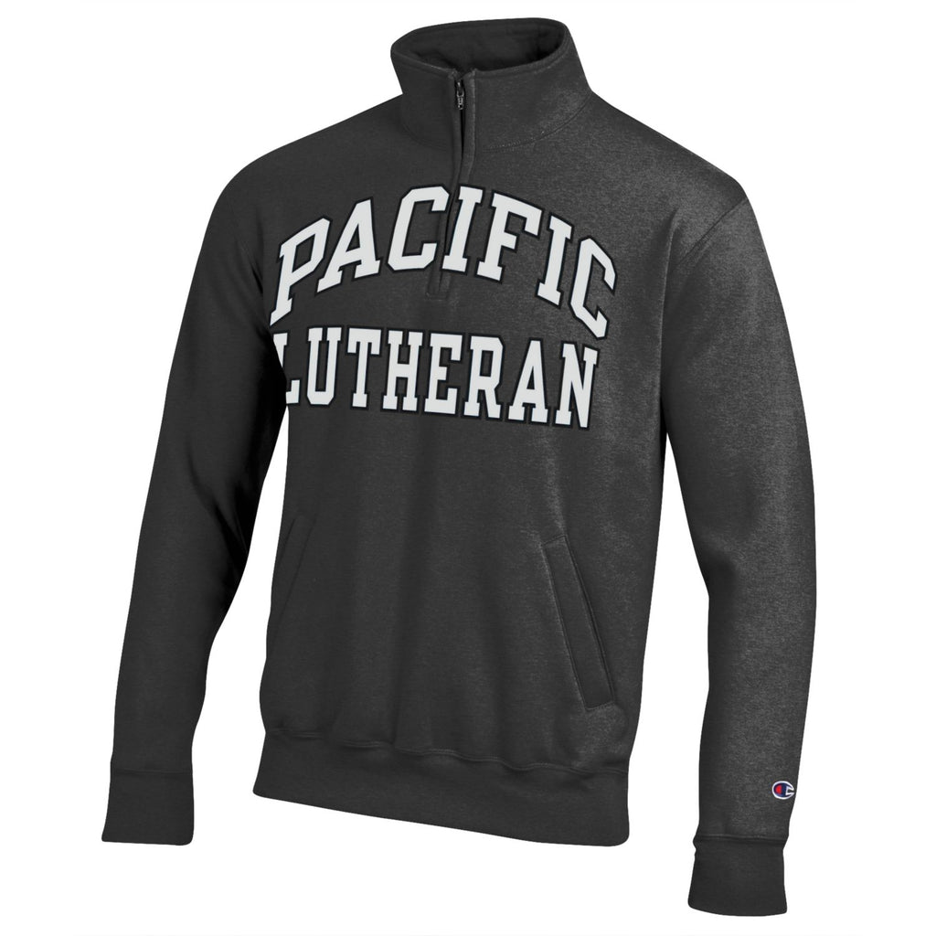 1/4 zip sweatshirt with letters, Pacific Lutheran. No pockets. Champion sweatshirt, Patch Heat Sealed Graphic.