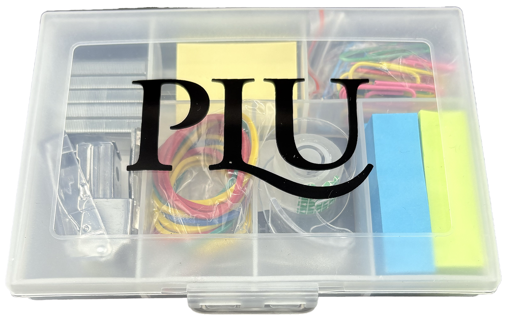 Desk accessories organized in a small plastic box with PLU on the lid.